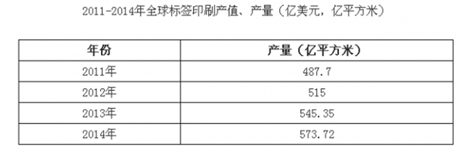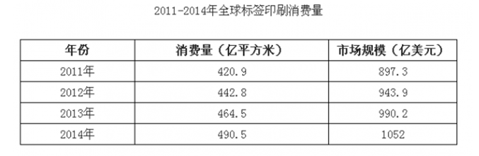 2013年全球標(biāo)簽印刷市場消費(fèi)量為486.91億平方米,2014年達(dá)到510.8億平方米,同比增長4.9%。